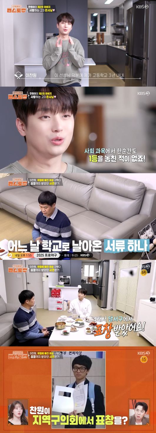 두 사람은 학창시절에 대한 기억들을 하나씩 털어놓는 가운데, 이찬원이 용감한 학생으로 지역에서 표창을 받았던 비화가 공개됐다. 선생님은 "학교로 서류가 하나 날라왔다. 지역구의회에서 제보가 들어왔다"고 운을 뗐고, 이찬원은 "그래서 달서구에서 표창 받았다"고 덧붙였다.