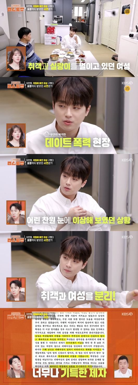 이찬원은 당시를 떠올리며 "친구를 만나러 가던 길이었다. 국밥집 앞에서 어떤 여성 분이 취객한테 너무 당하고 있었다. 지금으로 따지면 데이트 폭력 비슷하다"고 설명했다.