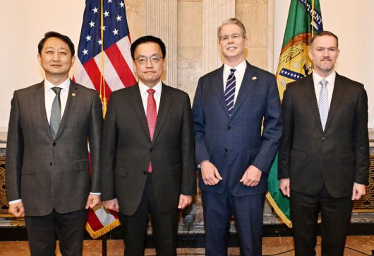 24일 미국 워싱턴 D.C. 재무부 회의실에서 안덕근(왼쪽부터) 산업통상자원부 장관과 최상목 경제부총리 겸 기획재정부 장관, 스콧 베선트 미국 재무장관, 제이미슨 그리어 미국무역대표부 대표가 한미 간 '2+2 통상 협의'에 앞서 기념사진을 찍고 있다. 산업부 제공 |