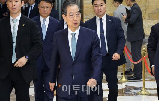 한덕수 대통령 권한대행 국무총리가 24일 서울 여의도 국회 본회의에서 추가경정예산안 시정연설을 마치고 퇴장하며 취재진을 향해 "수고하셨다"고 말하고 있다. 고이란 기자 photoeran@ |