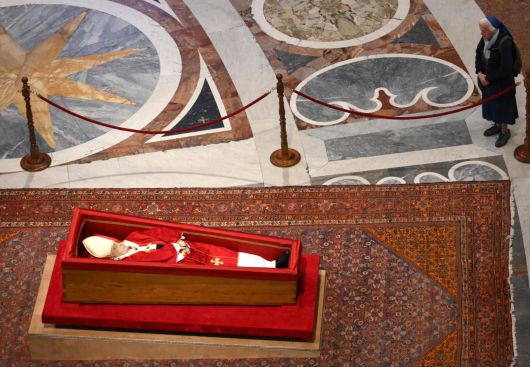 프란치스코 교황(88)의 장례식 일반인 조문 첫날, 수녀가 관례를 깨고 교황이 안치된 관 옆에서 조문을 하는 모습이 포착돼 화제가 되고 있다.