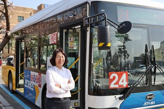 이시영씨가 용인 24번 마을버스 앞에서 촬영을 한 모습.(단국대 제공) |