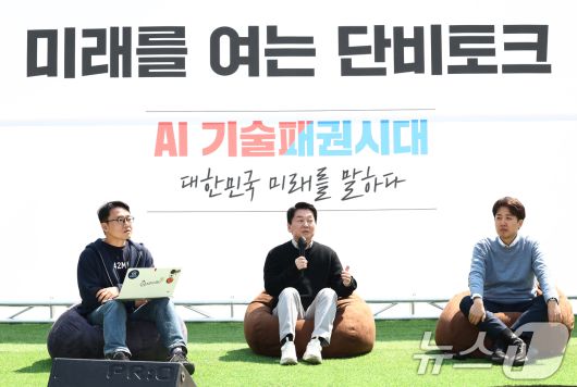 안철수 국민의힘 대선 경선 후보와 이준석 개혁신당 대선 후보가 25일 경기 성남시 판교역 인근 광장에서 열린 '미래를 여는 단비토크, Ai 기술패권시대 대한민국 미래를 말하다'에서 발언하고 있다. 2025.4.25/뉴스1 ⓒ News1 김민지 기자 |