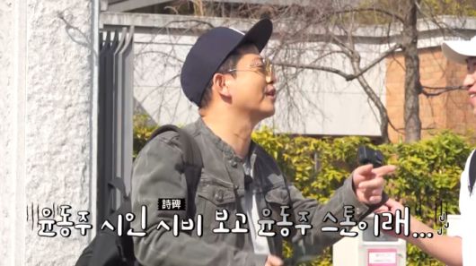 그런데 김준호는 시비 속 시를 읽어보다가 "원래 윤동주 시인의 대표 시는 '서시' 아닌가?"라며 의아해한다. 이어, "하늘을 우러러 한 점 부끄럼 없기를…"이라며 '서시'를 줄줄 읊는데, 장동민 역시 시비에 의문을 제기하더니, "여기가 아닌 것 같은데?"라고 말한다.