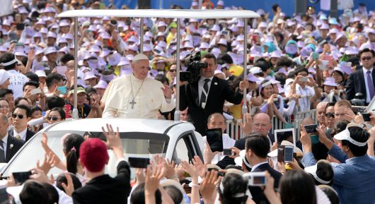 2014년 한국을 방문한 프란치스코 교황이 미사를 집전하기 위해 서울 광화문광장으로 향하며 인파에 인사를 건네고 있다. /뉴스1 |