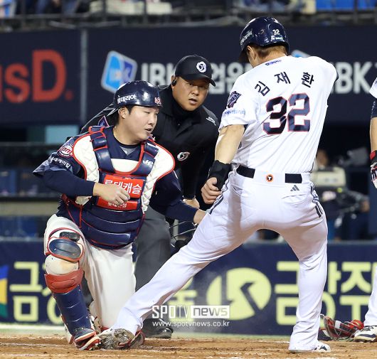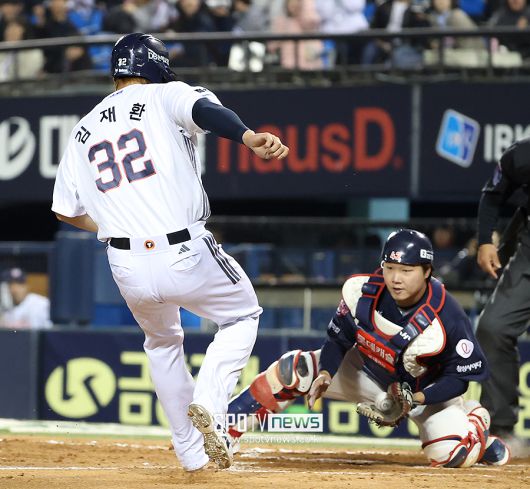 그러나 이 상황에서 김재환의 무리한 주루에 흐름이 끊겼다. 2루 주자 양석환이 득점에 성공했지만, 1루 주자 김재환이 홈을 가기는 무리였다. 고토 코치도 이 상황을 파악하고 질주하는 김재환에게 멈추라는 사인을 보냈지만 김재환은 이를 무시한 채 홈으로 달렸고 롯데 포수 정보근은 일찍이 그를 기다리고 있었다.