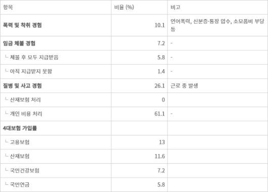 근로 중 질병 및 사고 경험이 있는 근로자도 26.1%나 됐습니다. 이중 산재보험으로 처리한 근로자는 없고 61.1%가 개인비용으로 처리한 것으로 나타났습니다. 4대보험 가입률도 고용보험 13.0%, 산재보험 11.6%, 국민건강보험 7.2%, 국민연금 5.8%에 불과했습니다.