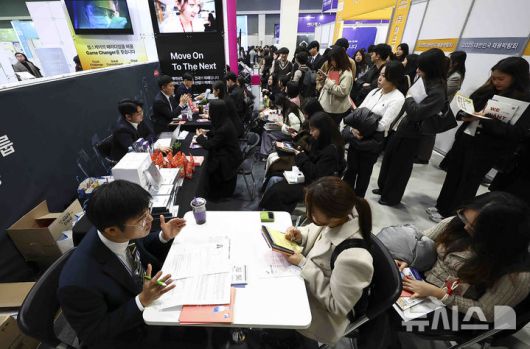 [서울=뉴시스] 김근수 기자 = 19일 서울 서초구 aT센터에서 열린 대한민국채용박람회에서 구직자들이 한 기업 부스에서 면접을 보고 있다. 2025.03.19. ks@newsis.com |
