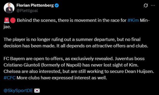 독일 유력지 '스카이스포츠 독일'의 저명한 플로리안 플레텐베르크 기자가 26일(한국시간) 자신의 사회관계망서비스(SNS)를 통해 최근 김민재를 둘러싼 이적설에 대해 다시 한 번 언급했다.
