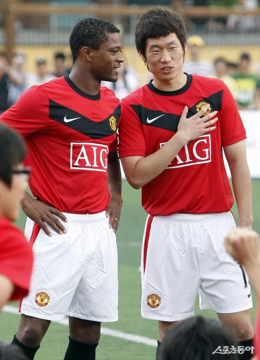 2009년 7월 23일 오후 서울 청구초등학교 운동장에서 열린 ‘나이키 맨체스터 유나이티드 축구교실’에서 에브라(왼쪽)와 박지성이 대화를 나누고 있다. 양회성 기자 yohan@donga.com |