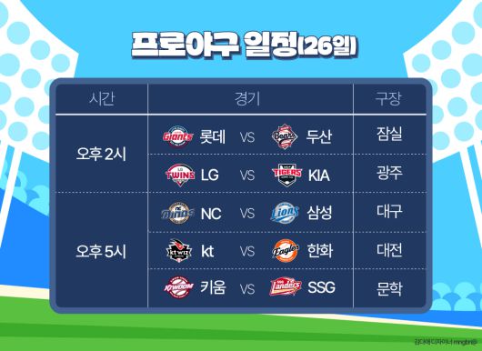 △4월 26일 프로야구 경기 일정- 롯데 vs 두산 (잠실·14시)- LG vs KIA (광주·14시)- NC vs 삼성 (대구·17시)- kt vs 한화 (대전·17시)- 키움 vs SSG (문학·17시) [이투데이/김다애 기자 (mngbn@etoday.co.kr)] ▶프리미엄 경제신문 이투데이 ▶비즈엔터이투데이(www.etoday.co.kr), 무단전재 및 수집, 재배포금지