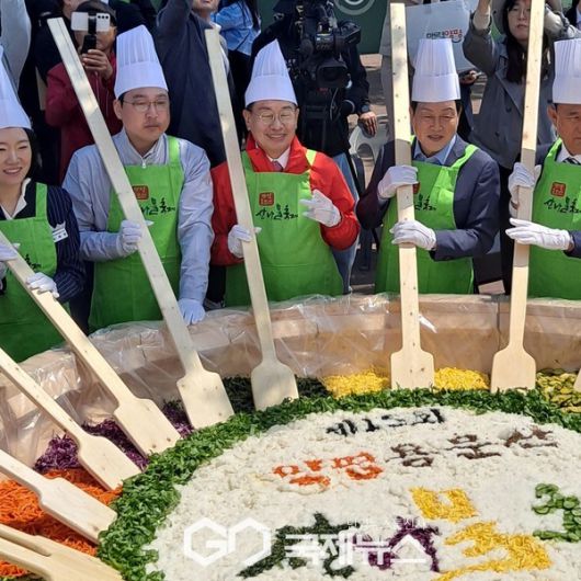 (양평=국제뉴스) 이재호 기자 = 4월 25일부터 27일까지 진행되는 양평 용문산 산나물 축제의 클라이막스인 비빔밥 퍼포먼스에서 500인분의 비빔밥을 비비기 위해 전진선 양평군수와 황선호 의장 그리고 김선교 국회의원이 환한 미소를 지으면 자세를 잡고 있다.