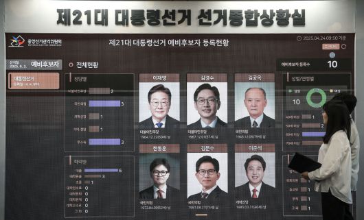 지난 4월24일 경기 과천 중앙선거관리위원회 선거종합사무실에서 선관위 직원들이 예비 후보 등록 현황판을 살펴보고 있다. 과천=뉴시스 |