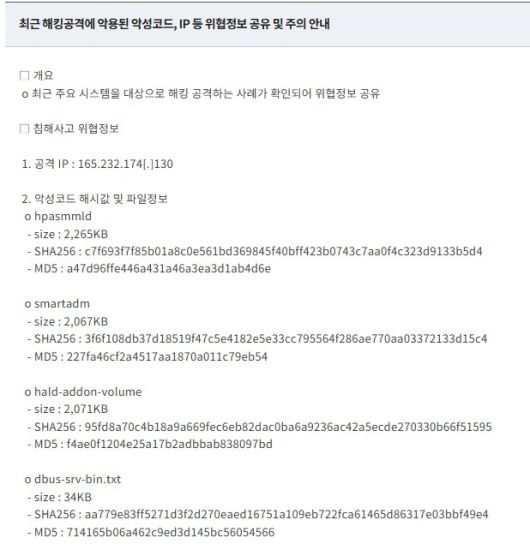 한국인터넷진흥원(KISA)은 지난 25일 ‘최근 해킹공격에 악용된 악성코드, IP 등 위협정보 공유 및 주의 안내’ 보안 공지문을 게시했다.