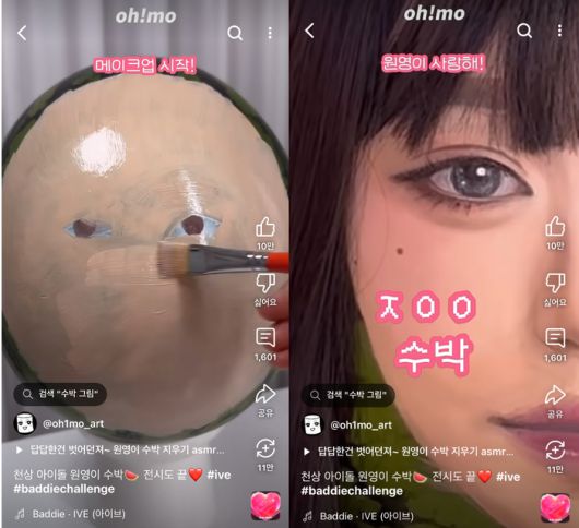 수박을 배경으로 아이돌 팬아트를 그리는 등 다양한 그림 콘텐츠를 업로드하는 크리에이터 ‘오!모 아트’의 유튜브 쇼츠 영상 [출처 = 오모 아트 유튜브 채널 캡처] |