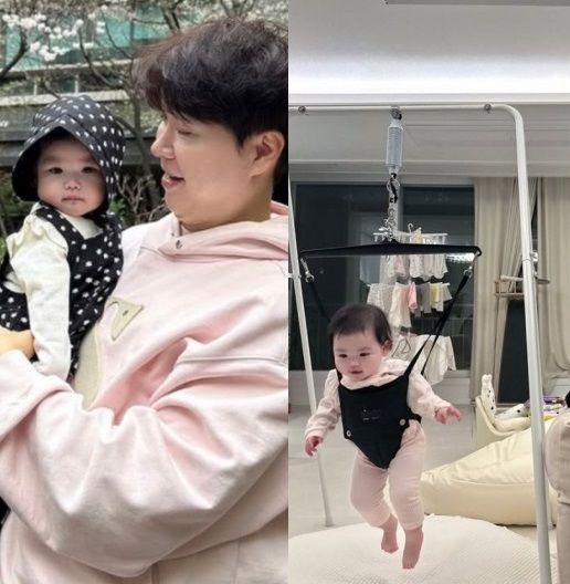 사진 속 박수홍 딸 박재이 양은 집에서 유아용 놀이기구 '점퍼루'를 타고 걷기 연습을 하고 있는 모습이다.