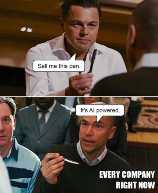 "이 펜을 나에게 팔아보세요"라고 하자, "이거 AI로 작동합니다"라고 답하는 상황을 묘사한 밈(Meme). 'AI'라는 말 자체가 마케팅 도구로 남용되는 현실을 풍자하고 있다. 영화 '울프 오브 월스트리트'의 한 장면을 패러디한 것으로, 영어권 커뮤니티인 레딧(Reddit) 등에서 많은 인기를 끌었다. Reddit 캡처 |