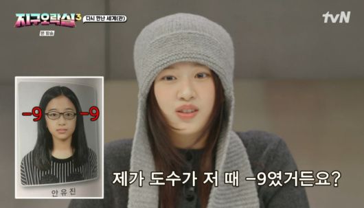 이에 안유진은 "저 때 도수가 -9였다. 저 안경을 써야되는 거냐. 교정도 되돌려야 한다"면서 진지하게 반응했다.
