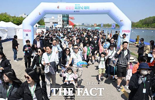 상상인 그룹 '2025 피크닉데이 가족, 동료와 함께 걷기' 행사가 26일 오전 경기 하남시 미사경정공원에서 열린 가운데 임직원과 가족들이 손을 흔들고 있다. /하남=박헌우 기자 |