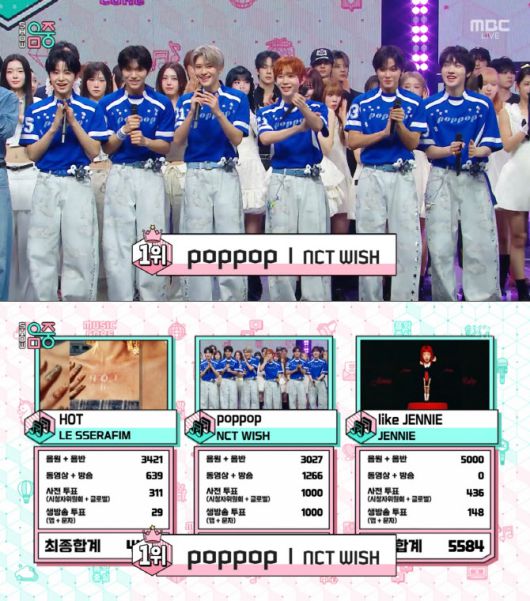 NCT 위시는 26일 방송된 MBC ‘쇼! 음악중심’에서 신곡 ‘팝팝’으로 르세라핌, 제니를 제치고 1위 트로피를 들어올렸다.