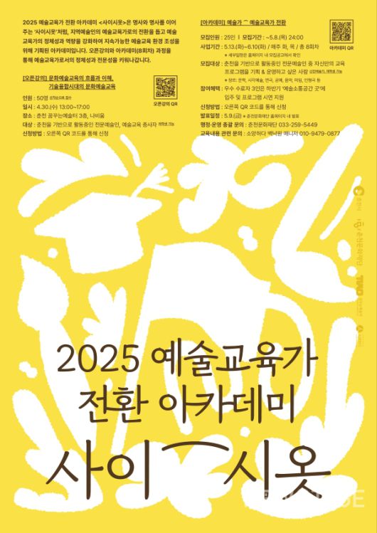 춘천문화재단(이사장 박종훈)은 지역 예술인의 예술교육가로의 전환을 지원하고, 교육 현장과의 연계를 강화하기 위해 '2025 예술교육가 전환 아카데미: 사이시옷'을 운영한다.
