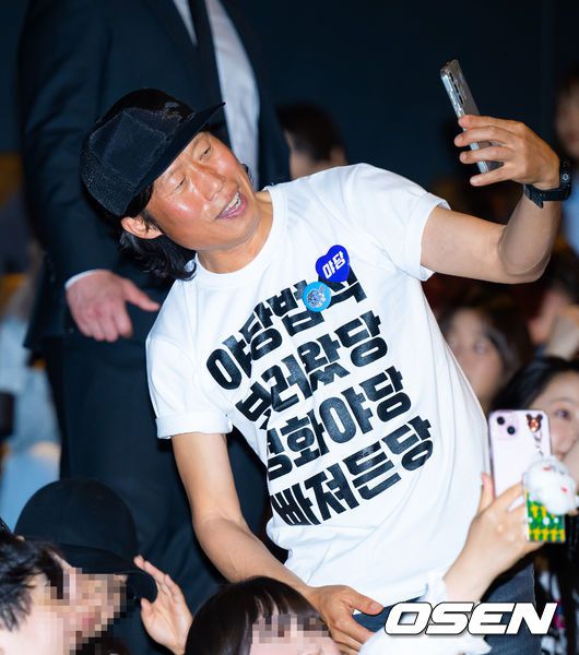 배우 유해진이 무대인사를 하며 영화 팬과 셀카를 찍고 있다.2025.04.26 / rumi@osen.co.kr