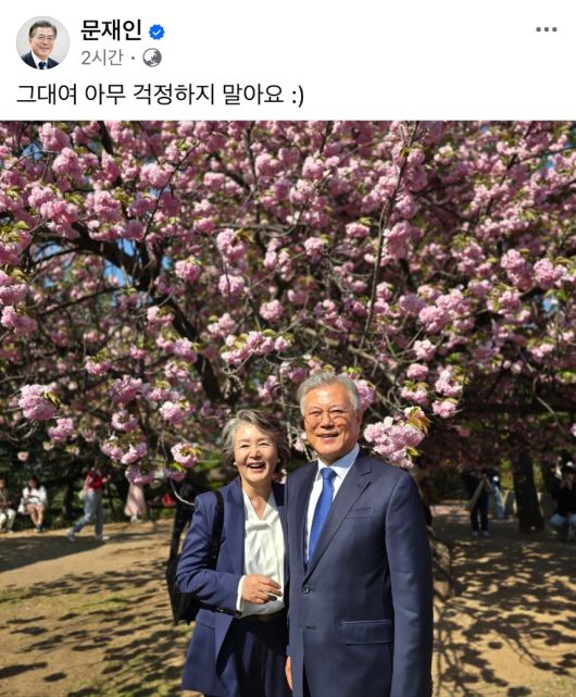 문 전 대통령은 26일 자신의 페이스북에 가수 전인권의 ‘걱정 말아요 그대’ 노래 첫소절인 “그대여 아무 걱정하지 말아요”라는 글과 함께, 꽃이 핀 나무 아래서 김정숙 여사와 함께 웃는 사진 한 장을 올렸다.