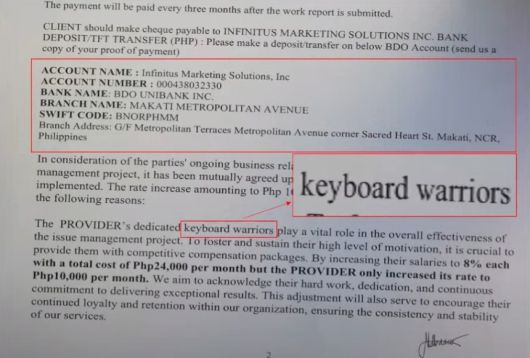 톨렌티노 의원은 필리핀 주재 중국 대사관과 현지 마케팅 기업 ‘인피니터스’ 간 계약서 사본을 증거로 제시했다. 이에 따르면 인피니터스는 전담 ‘키보드 워리어’(댓글부대)를 중국 대사관 측을 위해 제공한다고 적혀 있다. 인피니터스는 중국 정보기술(IT) 기업 화웨이, 알루미늄 제조업체 중왕 등 중국 기업들을 고객으로 둔 것으로 알려졌다.