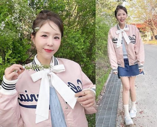 신지는 파스텔 핑크 컬러의 바시티 점퍼에 큼직한 화이트 리본 블라우스를 매치해 순식간에 ‘교복 코어’ 감성을 소환했다. 사진=신지 SNS |