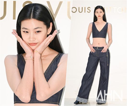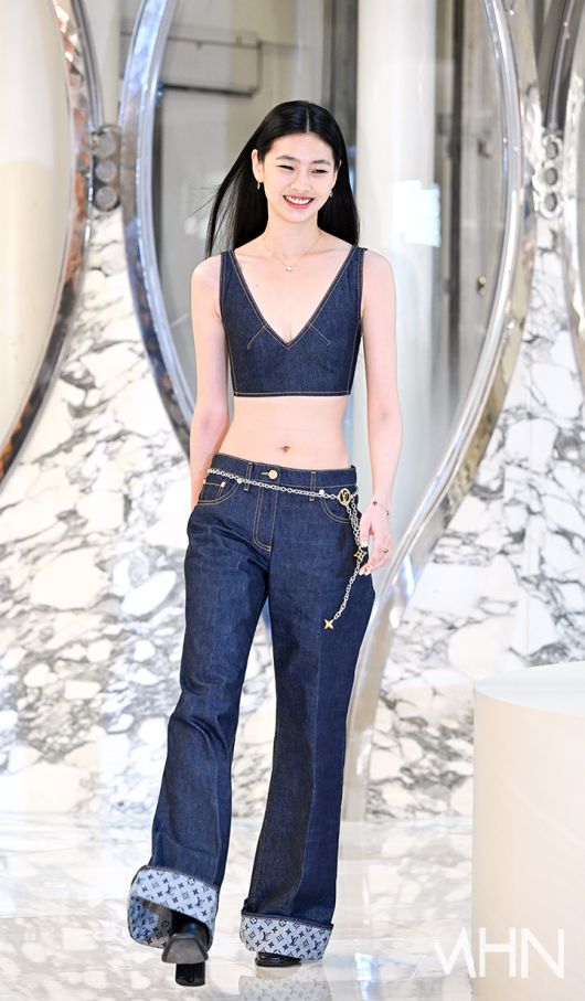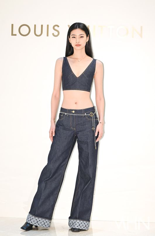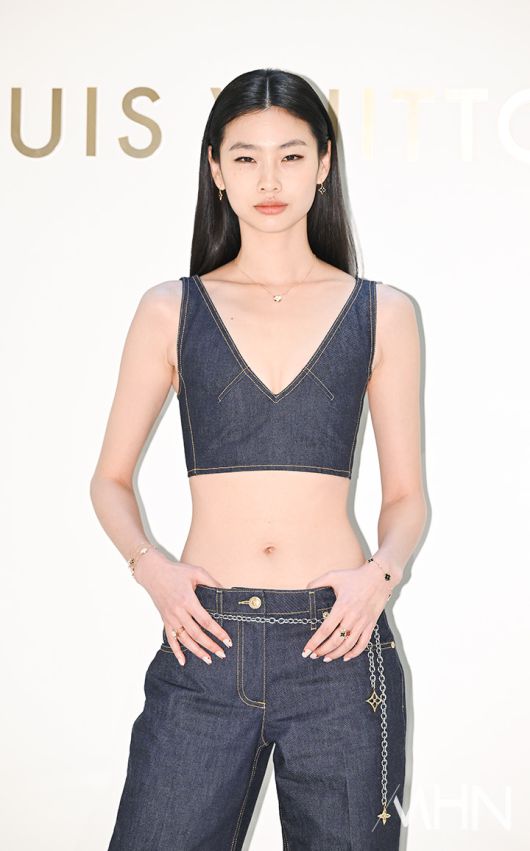 현재 브랜드 앰버서더로 활동 중인 정호연은 데님 크롭 톱과 와이드 팬츠 셋업 룩을 선택했다. 가슴골 라인이 깊게 파인 세련된 실루엣의 크롭 톱과 길게 떨어지는 와이드 팬츠, 로고 장식이 돋보이는 디테일들이 들어간 체인벨트 액세서리를 매치한 정호연은 청량하면서도 유니크한 분위기를 연출했다.