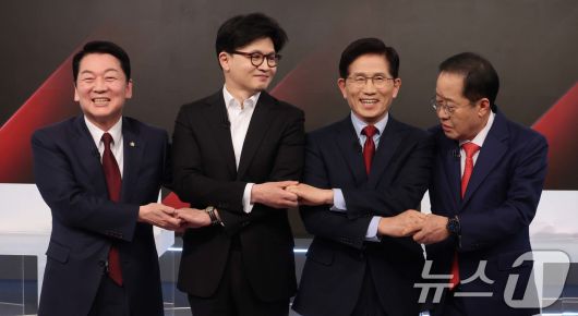 26일 서울 중구 매경미디어센터에서 열린 국민의힘 대통령 선거 제2차 경선 후보자 토론회에서 후보들이 기념 촬영을 위해 손을 맞잡고 있다. 왼쪽부터 안철수, 한동훈, 김문수, 홍준표 후보. 2025.4.26/뉴스1 ⓒ News1 국회사진취재단 |