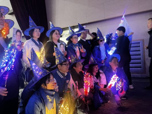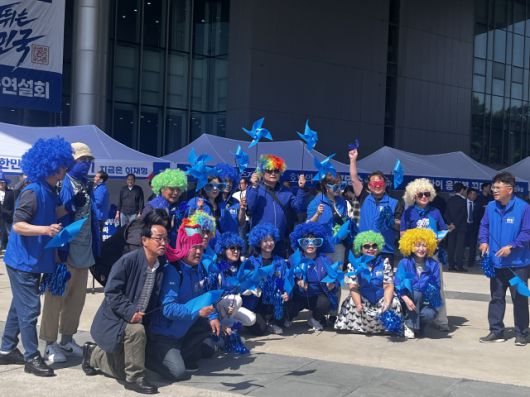 행사 시작이 가까워지자 현장은 파란색 물결과 함께 '이재명'을 외치는 지지자들의 목소리로 가득 찼다. 파란색 뽀끌이 가발과 파란색 바람막이를 착용한 지지자들이 깃발을 흔들며 사진 촬영을 이어갔다. 상어 인형탈을 쓴 한 시민은 가슴에 '잼딸' 스티커를 붙인 채 돌아다녔다. 트로트 음악에 맞춰 반짝이 의상을 입고 춤추는 지지자들과 곰돌이 복장을 한 사람까지 가세해 장외는 거리 퍼레이드를 방불케 했다.