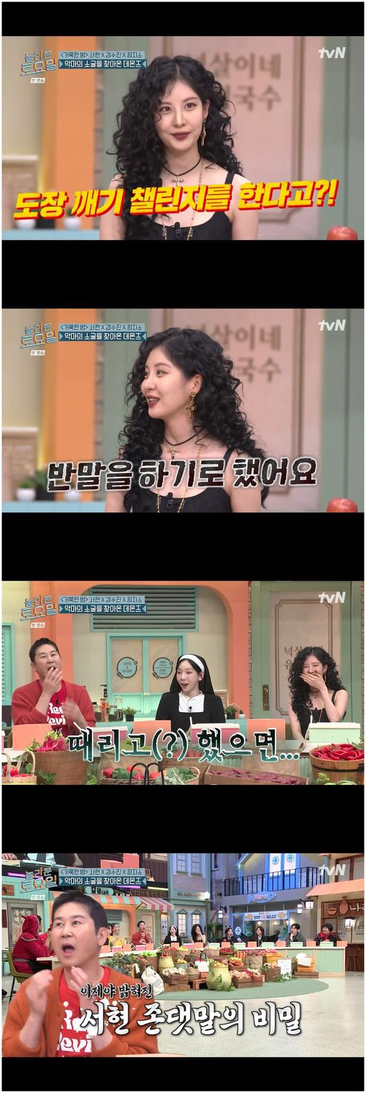 신동엽은 “오늘 놀토 멤버들 전부에게 반말을 한 번 해 봐라”라며 부추겼다. 그러자 넉살은 “신동엽에게 먼저 해 봐라”, 붐은 “‘신 선배, 잘 부탁해’라고 해 봐라”라고 말했고, 서현은 태연보다 신동엽에게 먼저 말을 놓는 진풍경을 보였다./osen_jin0310@osen.co.kr