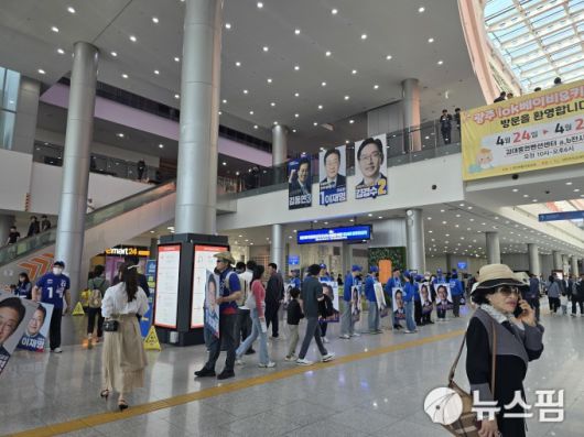 이 전 대표에 대한 압도적인 지지는 이날 광주 서구 김대중컨벤션센터에서 열린 민주당 대선 순회경선 현장에서도 확인할 수 있었다. 이 전 대표 지지자들이 컨벤션센터 앞 광장에서 파란옷과 응원봉을 들고 이 전 대표의 이름을 연호하는 등 응원 열기가 뜨거웠다.