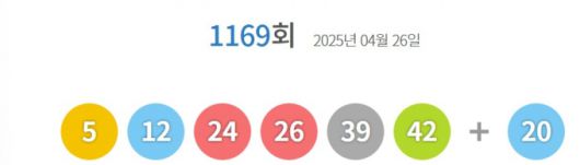 1169회 로또 당첨번호 "5·12·24·26·39·42"…보너스 번호 '20'
