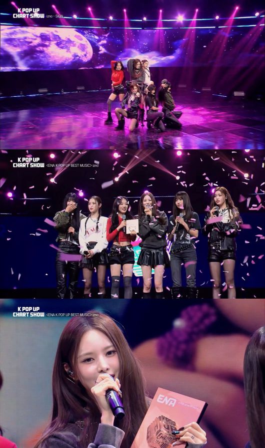 이즈나는 지난 25일 오후 방송된 ENA '케이팝업 차트쇼'에서 첫 번째 디지털 싱글 '싸인'(SIGN)으로 두 번째 1위 트로피를 품에 안았다.