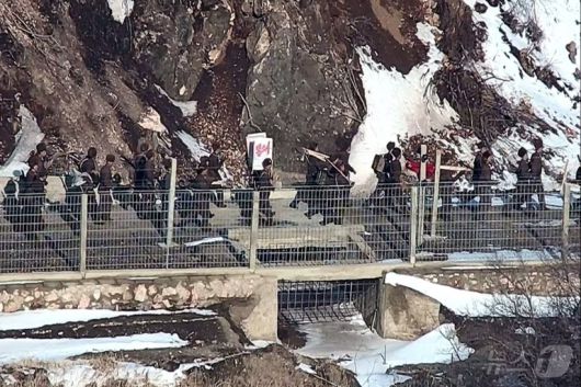 북한군이 서부전선 GP 일대에서 작업도구와 '봉쇄'간판을 들고 이동하는 모습. (합참 제공, 판매 및 DB 금지) 2025.3.27/뉴스1 |