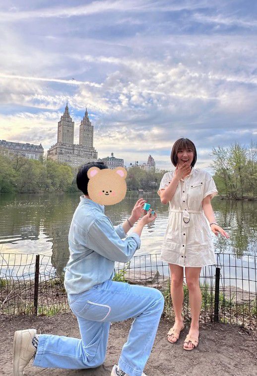 공개된 사진 속에는 연인에게 프러포즈를 받은 민의 모습이 담겼다. 특히 미국 뉴욕의 센트럴파크에서 무릎을 꿇고 반지를 건네는 남자친구의 모습이 인상적이다.