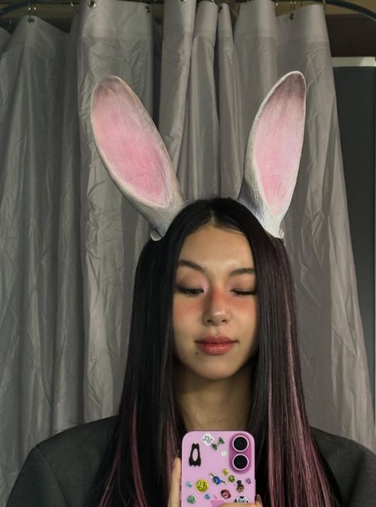 다른 사진에서는 토끼 귀를 착용하고는 핑크 브릿지 헤어와 블러셔로 특유의 매력을 자아냈다. 이에 깔 맞춤한 듯 화려하게 꾸며진 핑크 폰케이스도 시선을 사로잡는다.