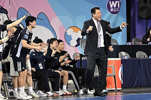 윤경신 감독이 이끄는 두산은 26일 서울 송파구 올림픽공원 핸드볼 경기장에서 열린 신한 SOL페이 2024-2025 핸드볼 H리그 남자부 챔피언결정전(3전 2승제) 3차전 SK 호크스와 경기에서 26-22로 이겼다. 사진은 모습. 2025.4.26 [한국핸드볼연맹 제공. 재판매 및 DB 금지]