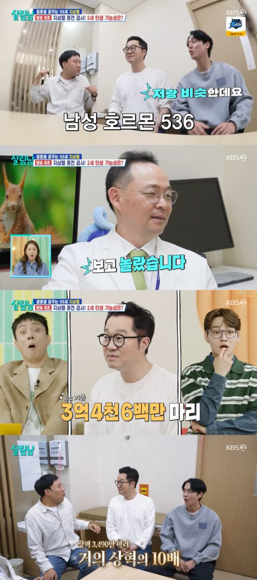먼저 김용명의 남성호르몬 수치는 611이었다. 의사는 “정액 양은 적다. 하지만 1cc에 4100만마리다. 운동성도 좋아서 2세 계획에는 문제가 없다”라고 전했다.
