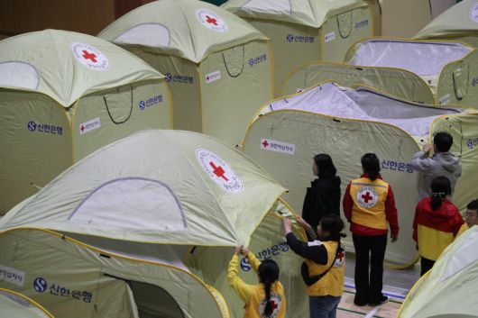 26일 오후 강원 인제군 기린면 기린실내체육관에서 자원봉사자들이 산불 주민 대피소를 설치하고 있다. 이날 오후 1시 18분쯤 인근 야산에서 불이 나 진화 작업이 이어지고 있다. 연합뉴스 |