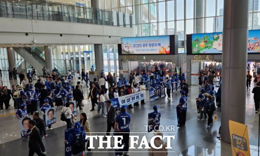 지역위원회 버스를 타고 현장을 찾은 당원들은 응원봉을 품에 안고 들뜬 모습으로 하나 둘 입장했다. /서다빈 기자 |