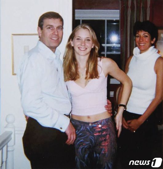 2021년 8월 9일(현지시간) 미국 뉴욕 남부 지방 법원이 공개한 2001년 당시 앤드루 왕자(왼쪽)와 원고 버지니아 주프레(중앙), 길레인 맥스웰(오른쪽) ⓒ AFP=뉴스1 ⓒ News1 김지현 기자 |