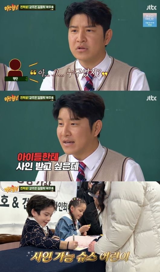 박주호는 “내가 프로 선수 16년이다. 국가대표 11년인데 아이들 아빠 1년 한 걸로 인지도가 더 유명해졌다. ‘나은이 아빠’ 한다”라고 말했다. 또 박주호는 “다른 사람들이 보면 나한테 사인받고 싶은 게 아니라 아이들한테 사인받고 싶어 한다. 아이들이 커 가면서 사인을 연습해서 요즘은 자기도 사인을 한다”라고 말했다.