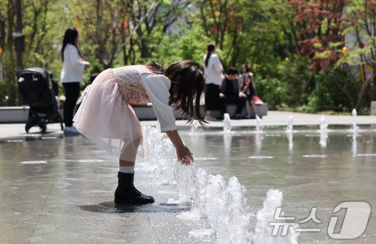 봄철 마지막 절기 곡우(穀雨)인 20일 서울 광화문광장에서 한 어린이가 바닥분수을 만져보고 있다. 기상청은 오늘 전국날씨 낮최고기온 서울 24도, 대전 25도, 광주 27도, 강릉 17 도, 대구 21도, 부산 17도를 기록하며 봄날씨 예보했다.2025.4.20/뉴스1 ⓒ News1 허경 기자 |