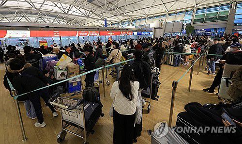 설 명절 앞두고 출국(영종도=연합뉴스) 신현우 기자 = 설 명절 연휴를 앞둔 22일 오전 인천국제공항 제1여객터미널 출국장에서 승객들이 탑승 수속을 위해 줄을 서고 있다.     올해 설 연휴 기간 국내 공항을 통해 130만여명이 해외여행을 떠날 것으로 예상된다. 오는 24일부터 다음 달 2일까지 열흘간 하루 평균 출발 승객은 13만4천명으로, 작년 설 연휴 일평균(11만7천명)보다 13.8% 증가할 전망이다. 2025.1.22 nowwego@yna.co.kr