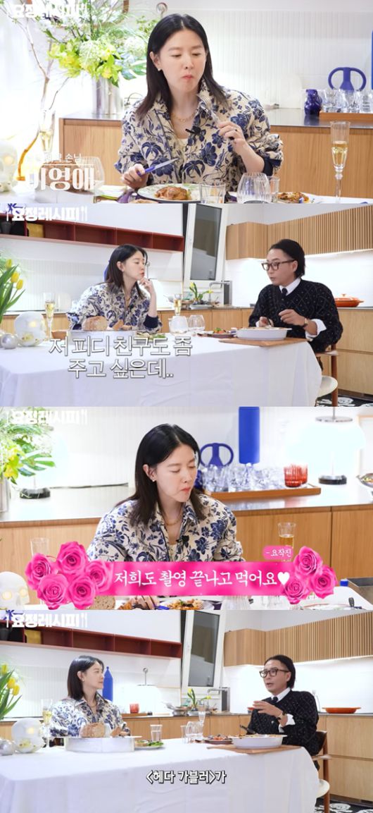 가지 그라탕의 맛을 묻자 이영애는 "아니 우리 (PD) 친구도 주고 싶다. 안 먹었을 텐데 미안해서"라며 "조금만 주자. 너무 맛있다. 혼자 먹기 미안하다"고 말했다. 이에 제작진은 자막을 통해 '촬영 끝나고 먹는다'고 적었다.