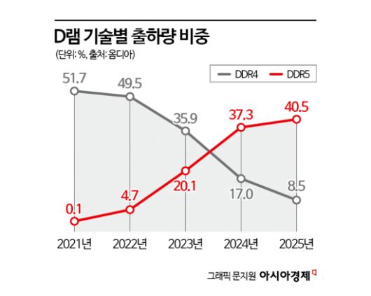 지난해 삼성전자 D램 매출에서 DDR4가 차지하는 비중은 약 30%였다. 삼성전자는 올해 DDR4 매출 비중을 10% 미만으로 줄이고 고부가 D램 비중을 늘릴 예정이다. 삼성전자 관계자는 "DDR4의 경우 자연스럽게 '페이드 아웃'된다고 보면 된다"며 "DDR4는 중국 업체들과 경쟁을 해야 하는데 더 성능이 좋은 DDR5가 있으니 주력 제품을 전환해가는 것"이라고 설명했다.