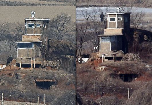 지난 3월 19일 오전 경기도 파주시 오두산전망대에서 바라본 북녘 황해북도 개풍군 마을 북한군 초소 위 감시카메라가 기존 대비 신형으로 교체돼 있다. 오른쪽은 지난해 동일한 초소에 설치된 감시 카메라 모습. 뉴스1 |